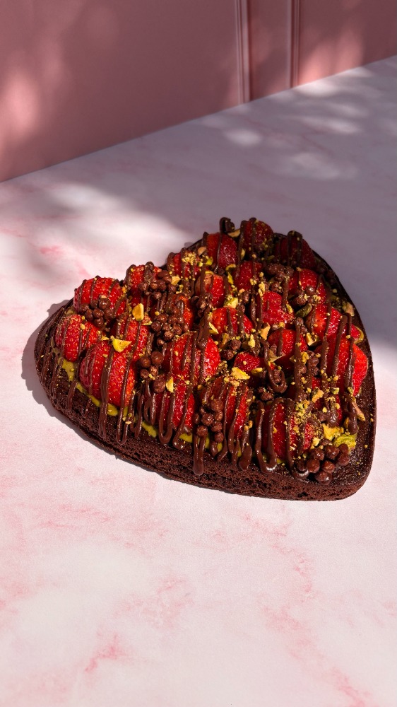 Brownie de chocolate en forma de corazon, húmedo por dentro. Con crema de pistache arriba, pistaches, fresas frescas y mas chocolate.