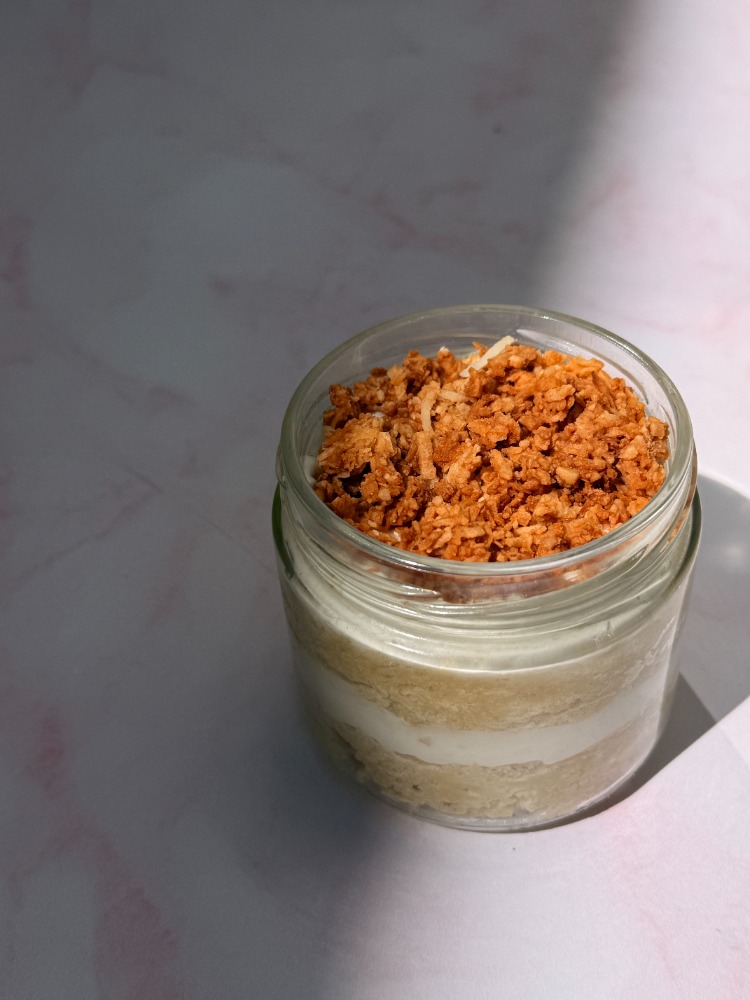 Ingredientes: Almendra, bebida de coco, huevo, harina de coco, aceite de coco, monk fruit, extracto de vainilla natural, sal del Himalaya, polvo para hornear sin aluminio.