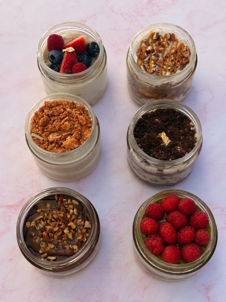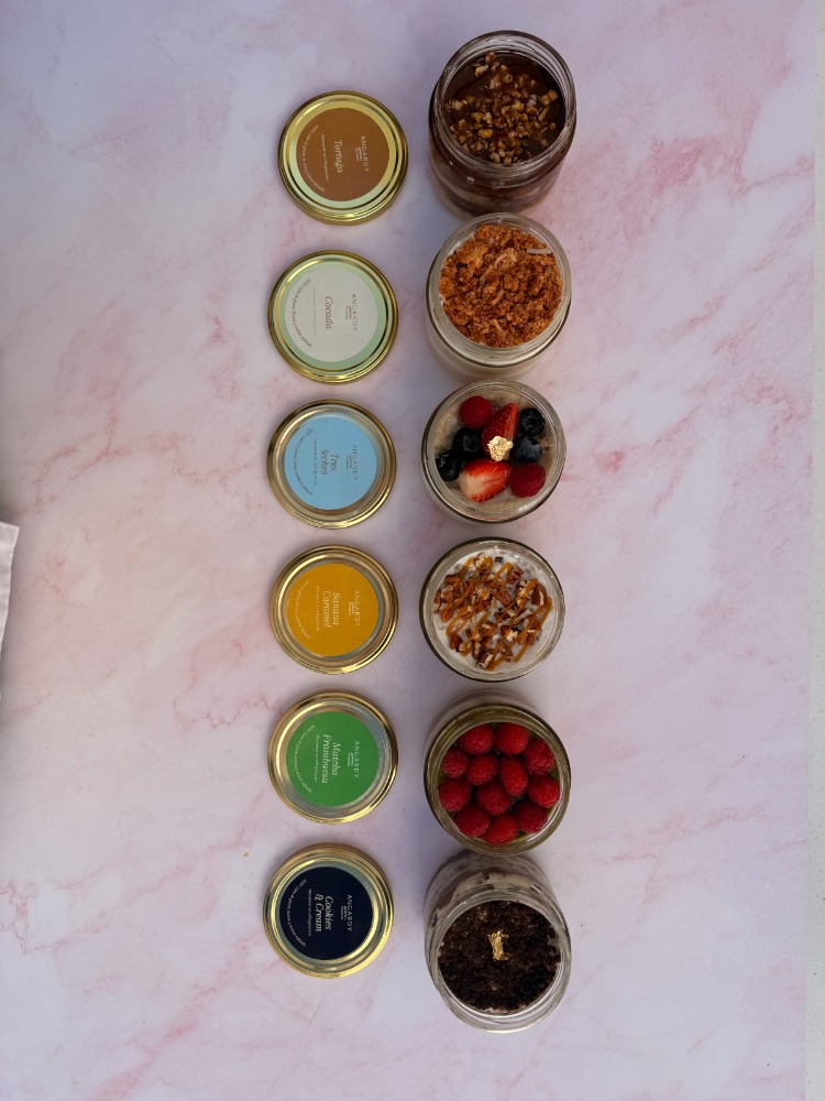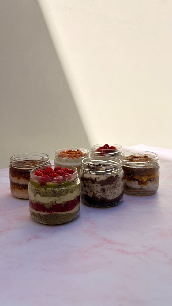 Tarros de pastel con capas y diferentes texturas crujientes y húmedas. Cada surtido incluye una selección de sabores de nuestra colección de cake jars, pensados para disfrutarse fríos y directamente del tarro.